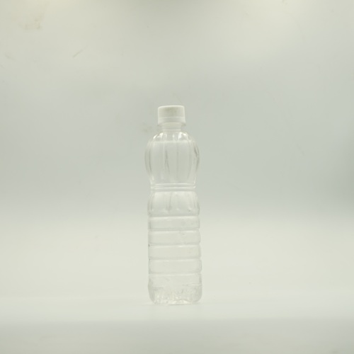 الصورة تُظهر زجاجة بلاستيكية شفافة مملوءة بسائل أصفر اللون، وهي مغلقة بغطاء أبيض. الزجاجة ذات تصميم مضلّع يُساعد على الإمساك بها بسهولة. الخلفية بيضاء وموحدة مما يُبرز الزجاجة بوضوح. السائل يبدو شبيهًا بالزيت أو أي سائل آخر للاستخدام الغذ