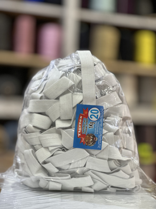 هذا المنتج عبارة عن مطاط خياطة (إلاستيك) بلون أبيض، مثالي للاستخدام في أعمال الخياطة والتفصيل. يحمل الملصق رقم المنتج 20 وهو معبأ بوزن 1 كيلوغرام، مما يجعله خيارًا مثاليًا للمشاريع الكبيرة أو المستمرة.