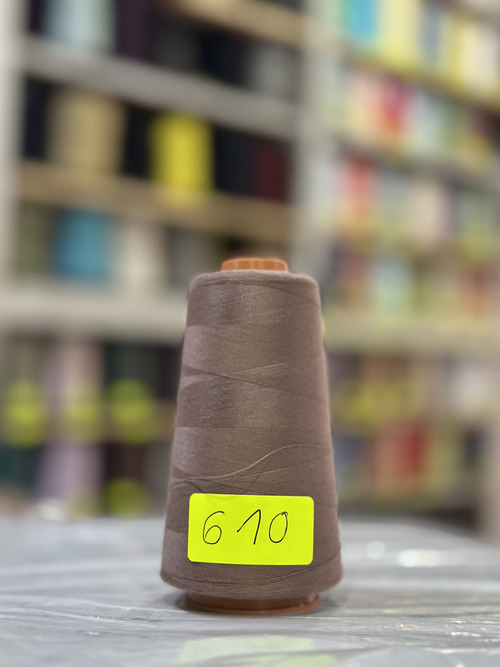 هذا خيط خياطة نوع 40/2 يظهر بلون بني فاتح كما يعكس الضوء على البكرة، ويحمل رقم اللون 610 المكتوب بوضوح على الملصق الأصفر. يُستخدم هذا الخيط بشكل أساسي في الخياطة بالغرزة المستقيمة ويمكن أيضًا استخدامه كخيط مساعد في ماكينات السرفلة، مما يجعله متعدد