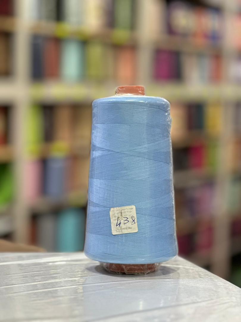 في الصورة بكرة خيط خياطة كبيرة بوزن يقارب 400 غرام، ملفوفة بلون أزرق فاتح جذاب. الخيط يحمل رقم اللون 438 حسب الملصق المثبت عليه، مما يسهل عملية التعرف عليه واستخدامه في المشاريع المختلفة. هذه البكرة مناسبة بشكل مثالي للاستخدام في ماكينات الخياطة المختلفة وتعد خ
