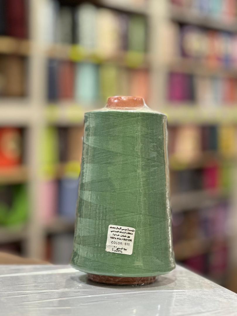 في الصورة نرى بكرة خيط خياطة كبيرة بوزن يقارب 400 غرام، ملفوفة بخيط ذو لون أخضر مميز، ويظهر على الملصق المثبت على البكرة رقم اللون 511. هذه البكرة مصنوعة من البوليستر، مما يجعلها مناسبة للاستخدام في ماكينات الخياطة المختلفة وتلبي احتياجات ورشات الخياطة و